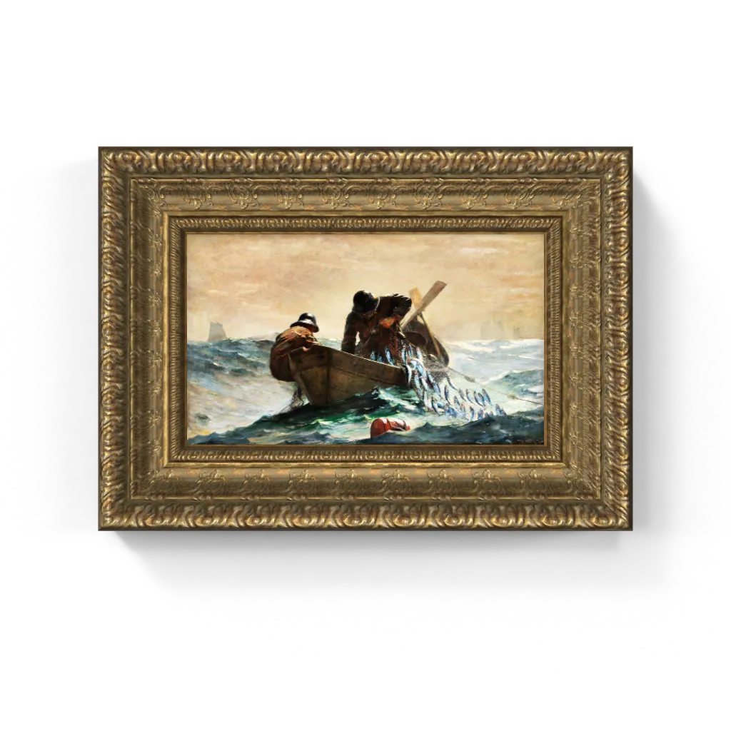 Homer’s deep respect for the strength and dignity of working men is evident in every stroke. The scene is tense and alive: waves crest in dark grays and blues, the boat lurches with the weight of the catch, and the figures move with practiced urgency. His brushwork is bold, his palette moody yet natural, and his composition carefully balanced to evoke both the drama and monotony of life at sea.
